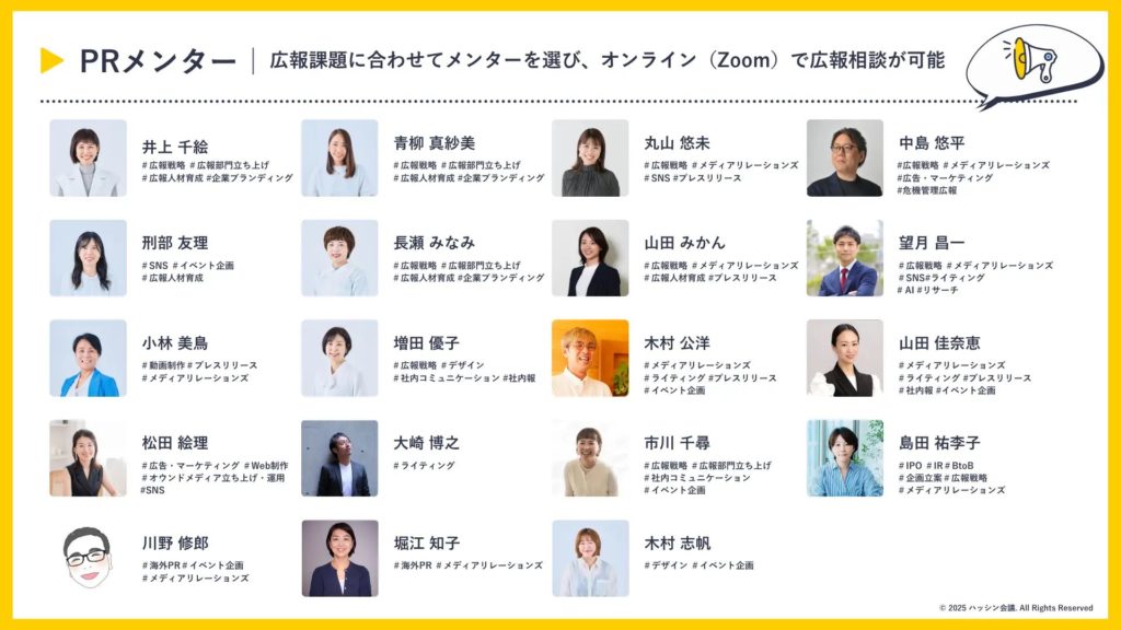 ハッシン会議は、企業内の広報担当者や「ひとり広報」が安心して相談できる場として、広報人材育成・PR伴走支援を行う専門コミュニティです。近年、地方広報・IPO・IR・生成AI活用など、広報ニーズが多様化していることを受け、この度新たに4名のメンターが選任されました。